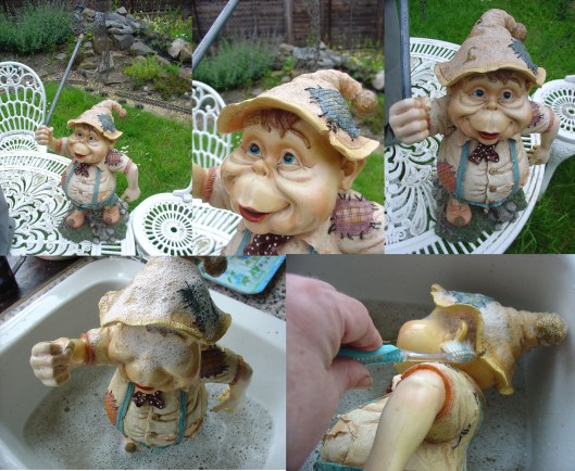 He had the much-needed scrub behind the ears, and a bubble bath.  His little arms were quite faded, and his hat was almost colourless.  So, his hat was painted, as was his skin, and he had some colour put back into his cheeks!