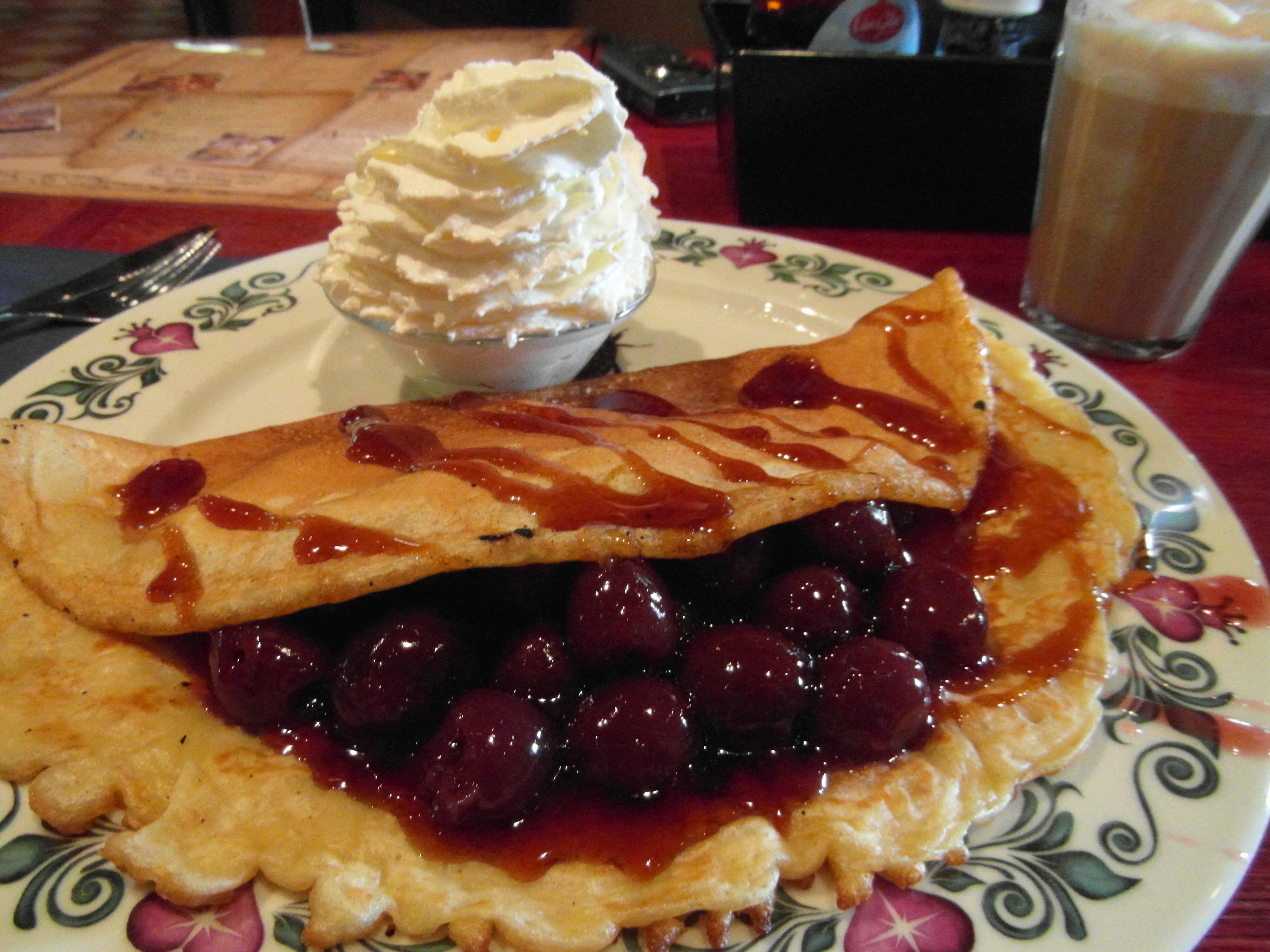 We had the Pineapple and Ginger pancake, and the Hot Cherries pancake. The Hot Cherries were snuggled inside the hot soft pancake, with whipped cream on the side, and it tasted divine!