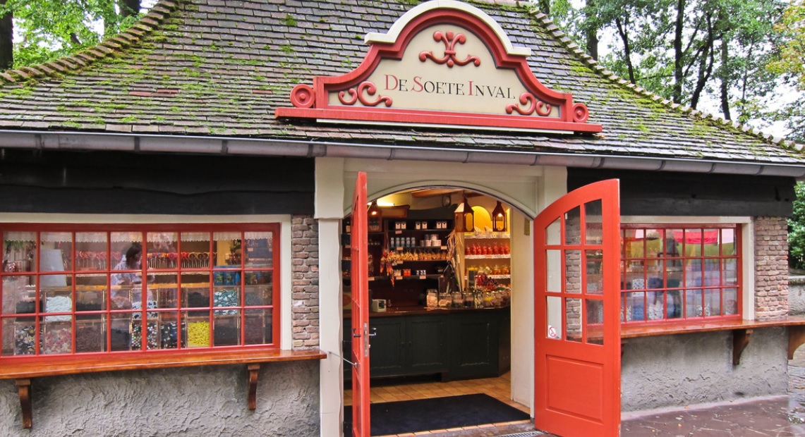 De Soete Inval is located to the right of the Efteling Museum (as if you are looking at it straight on) and opposite a first aid station.