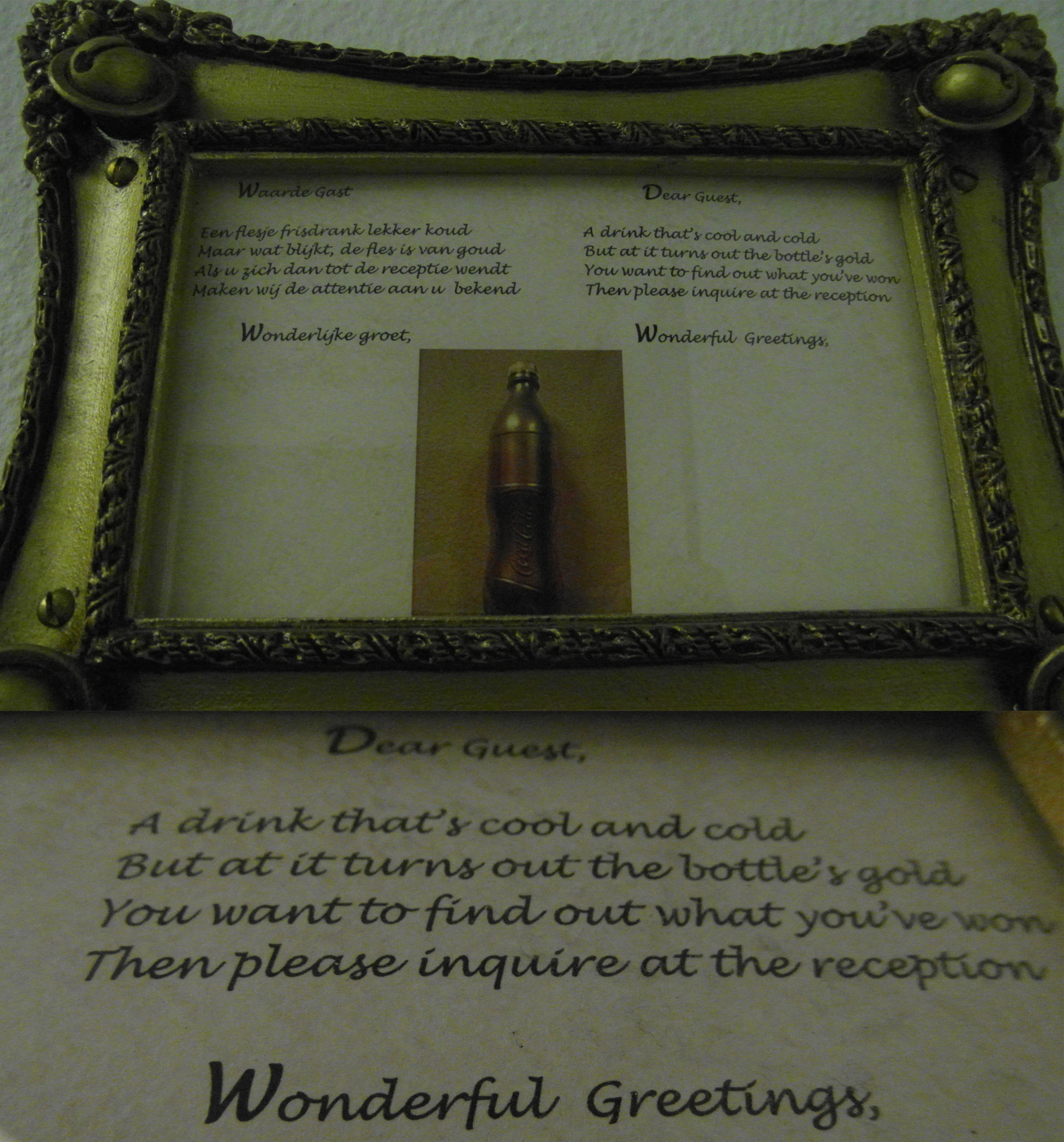 If you have stayed at the Efteling Hotel, you will have noticed vending machines on every other floor next to the elevators. We noticed that on the wall next to the machines, was a photo frame that contained a message…