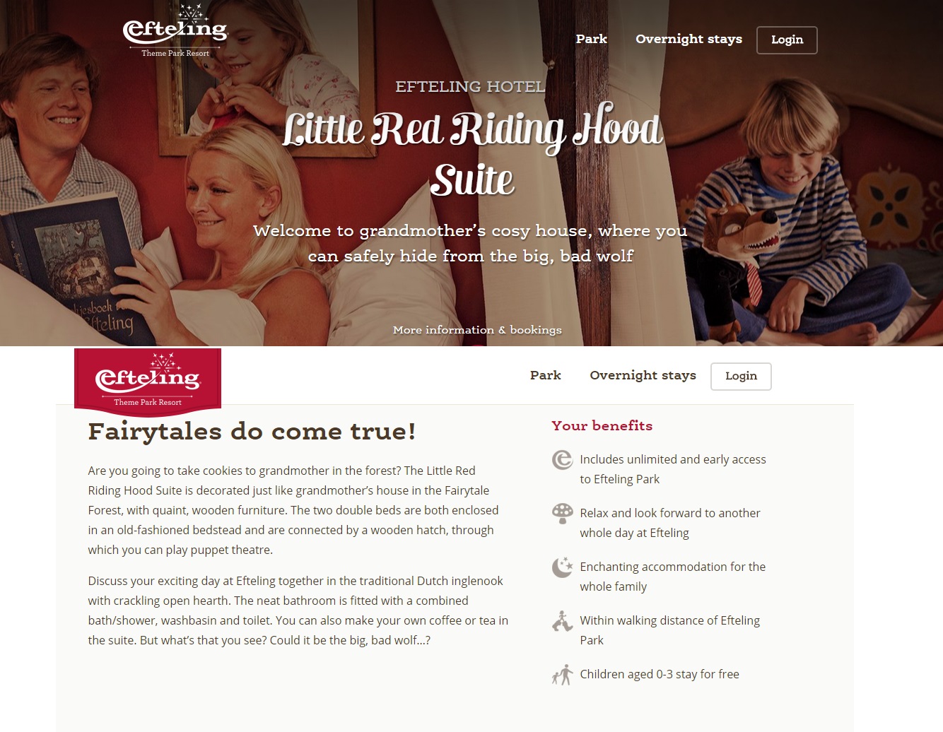 For a long time, the main part of Efteling’s website has looked a lot different from many of the other pages. Some of the site was updated, the rest was not, for example; the booking accommodation pages were still the same as they had been for years. Until now! Those pages have finally caught up with the rest of the site, and they look wonderful. Aside from looking good, the pages function better, and there is a better explanation of amenities and what is included in the price of your room. There are also better explanations of what can be expected of each themed room (very important if you’re planning on spending the extra cash to stay in one of these rooms).