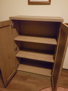 The slim wardrobe in the hallway has a space for hanging clothes, a safe and a cubby space. I don’t think the hanging space is big enough to hang dresses comfortably in summer so that is unfortunate for people who don’t like creases. Also when you open the wardrobe door you tap the light switch on the wall. So if you aren’t careful you end up turning the living room light off.
