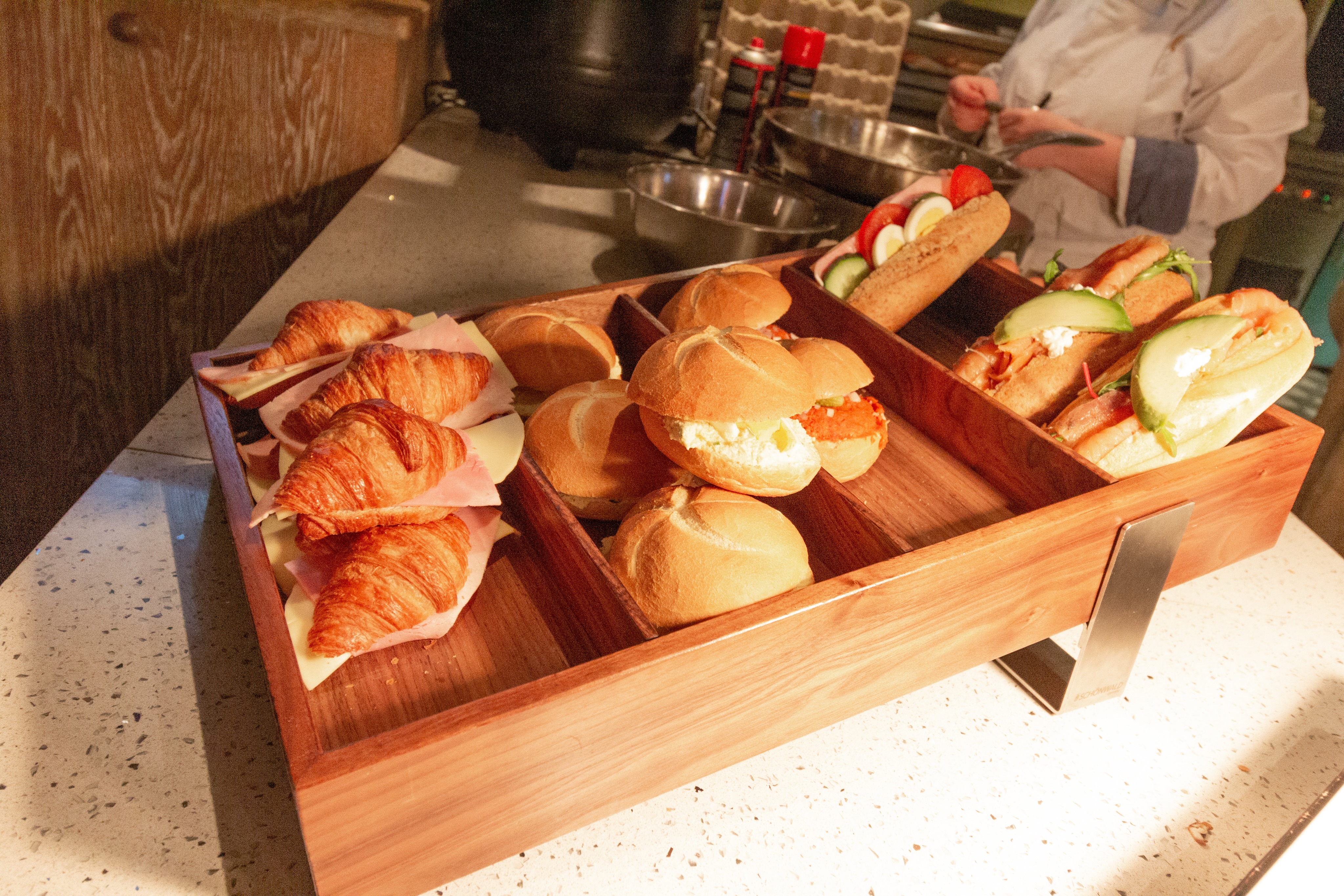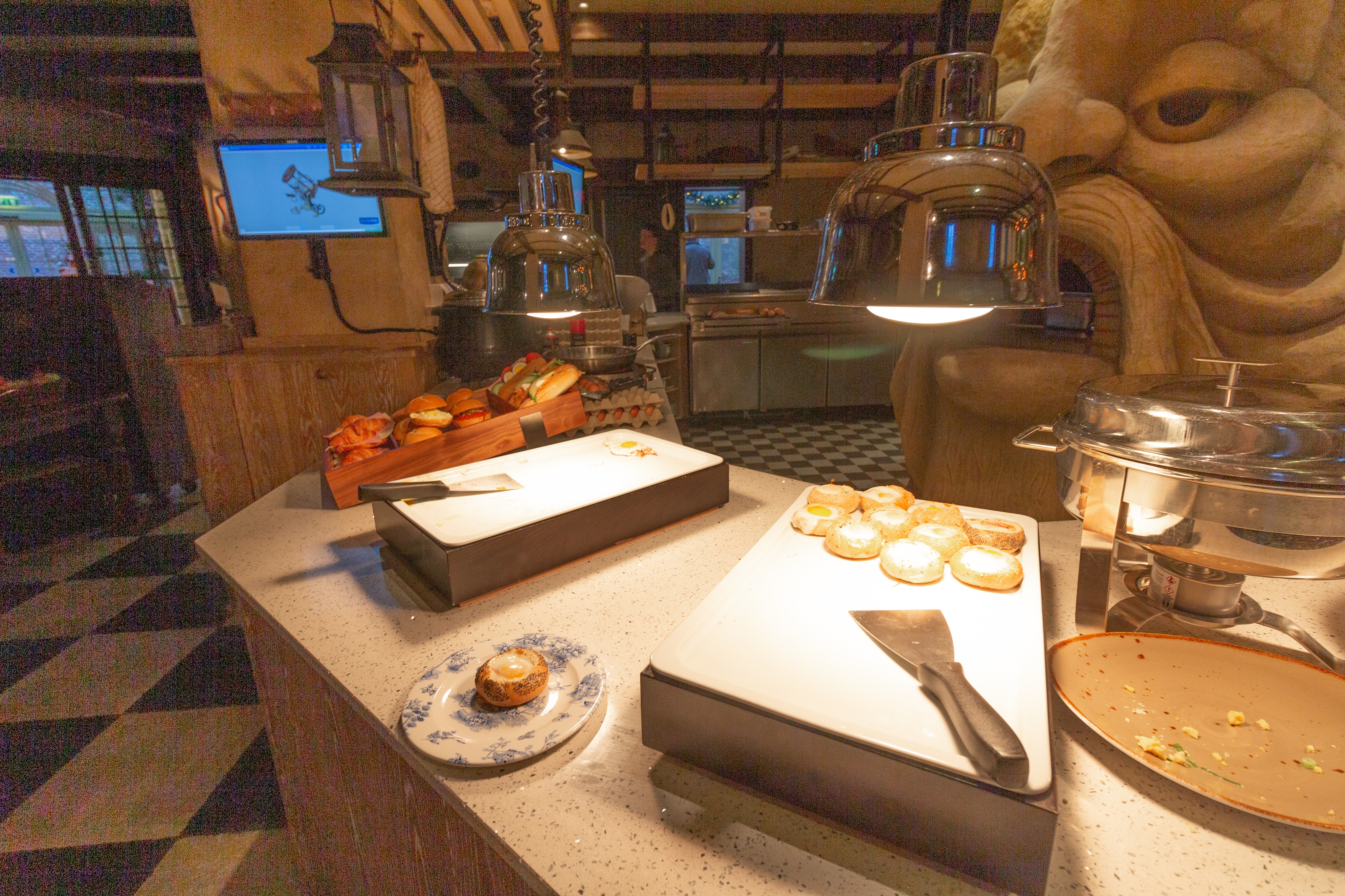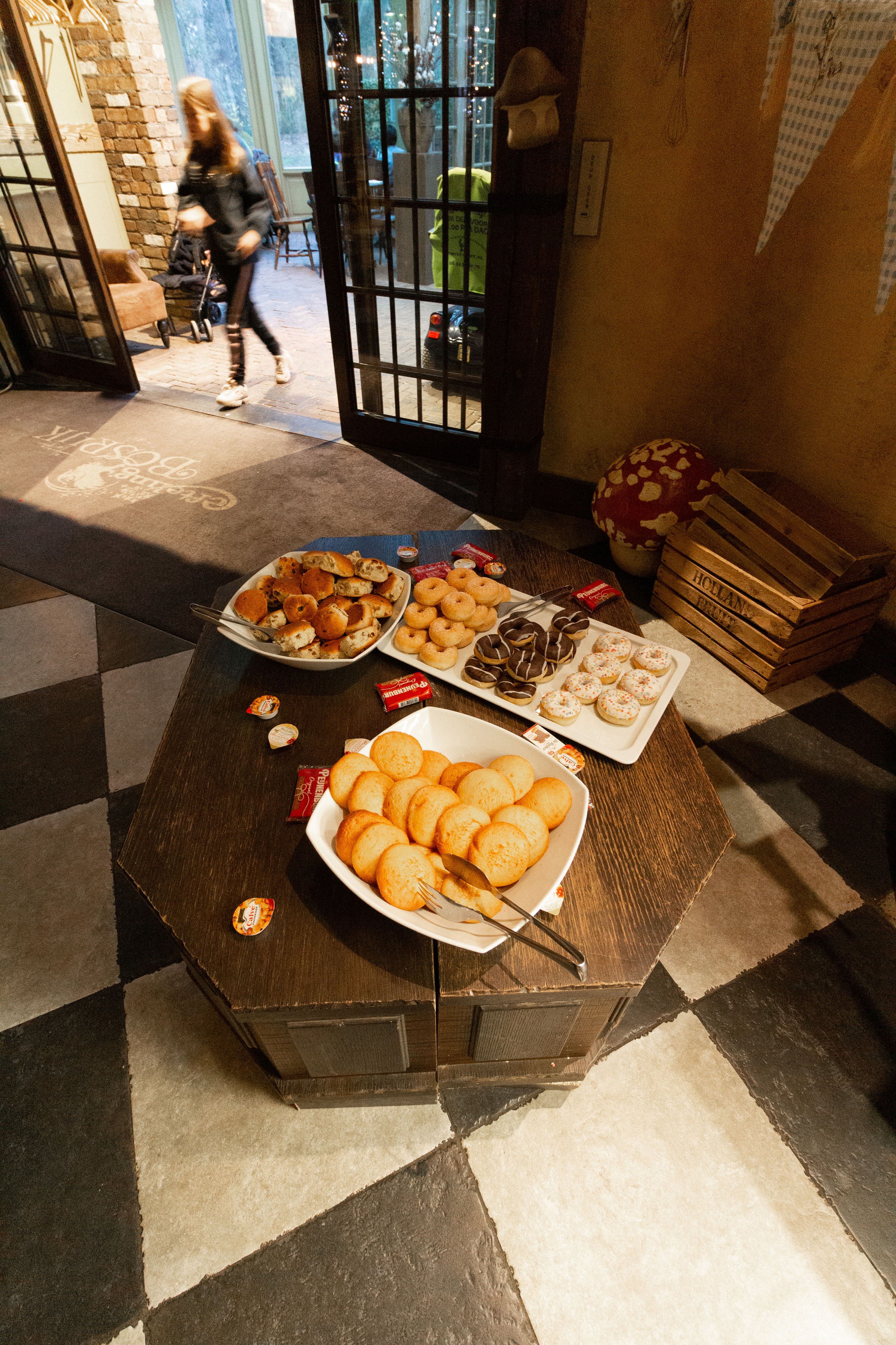 There were various cold meats and cheeses, chocolate and fruit sprinkles, peanut or hazelnut butters, jams and yoghurt, coco pops, muesli and granola, fresh bread and pastries, mini donuts, eierkoeken, full sandwiches with different fillings (there were no labels :-(), fruit and ontbijtkoeken. Cold boiled eggs, warm fried eggs, warm hollowed out bread buns with bacon and egg inside and hot scrambled eggs. There was even a little basket with gluten free bread things.