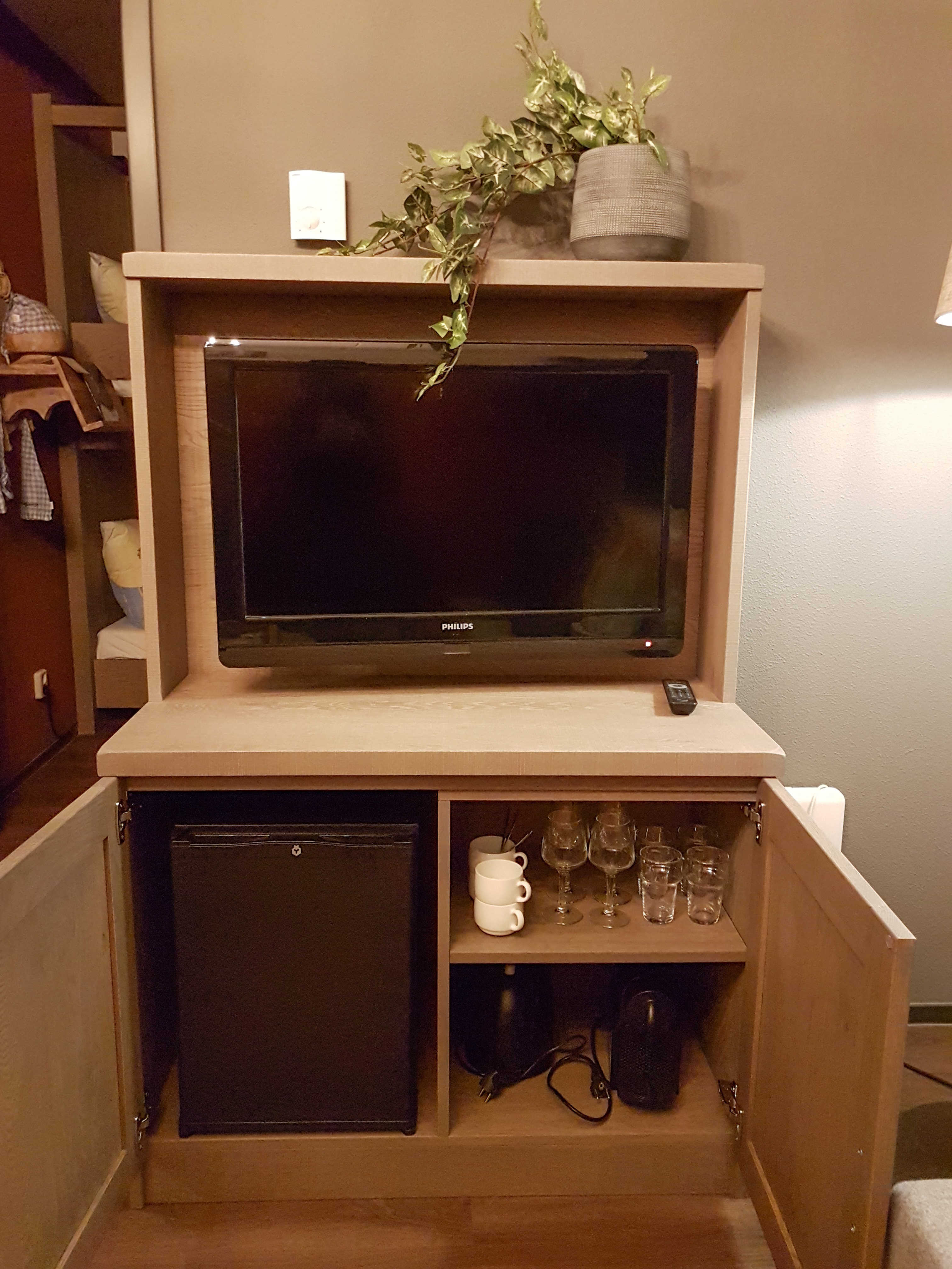 Under the TV in the cabinet you’ve got the mini fridge which is useful. We used it to store leftover salad that we had ordered. But I imagine in summer it would be great for cooling water bottles or sandwiches. Some people may need a cool place to store medicines or breast milk too so it’s a very useful feature.