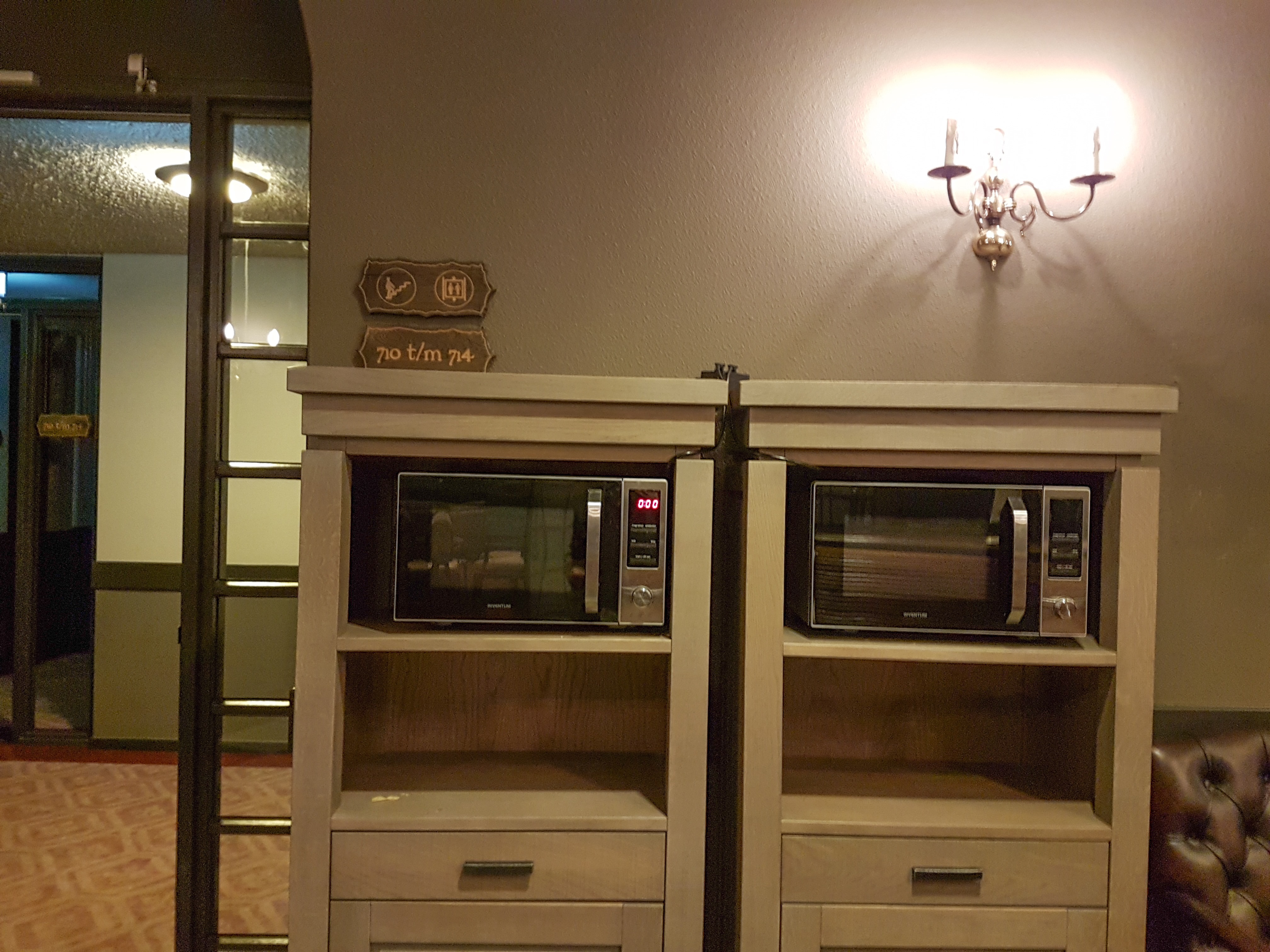 There are no longer microwaves in the room but on the ground floor they have installed two microwaves for the guests to use.