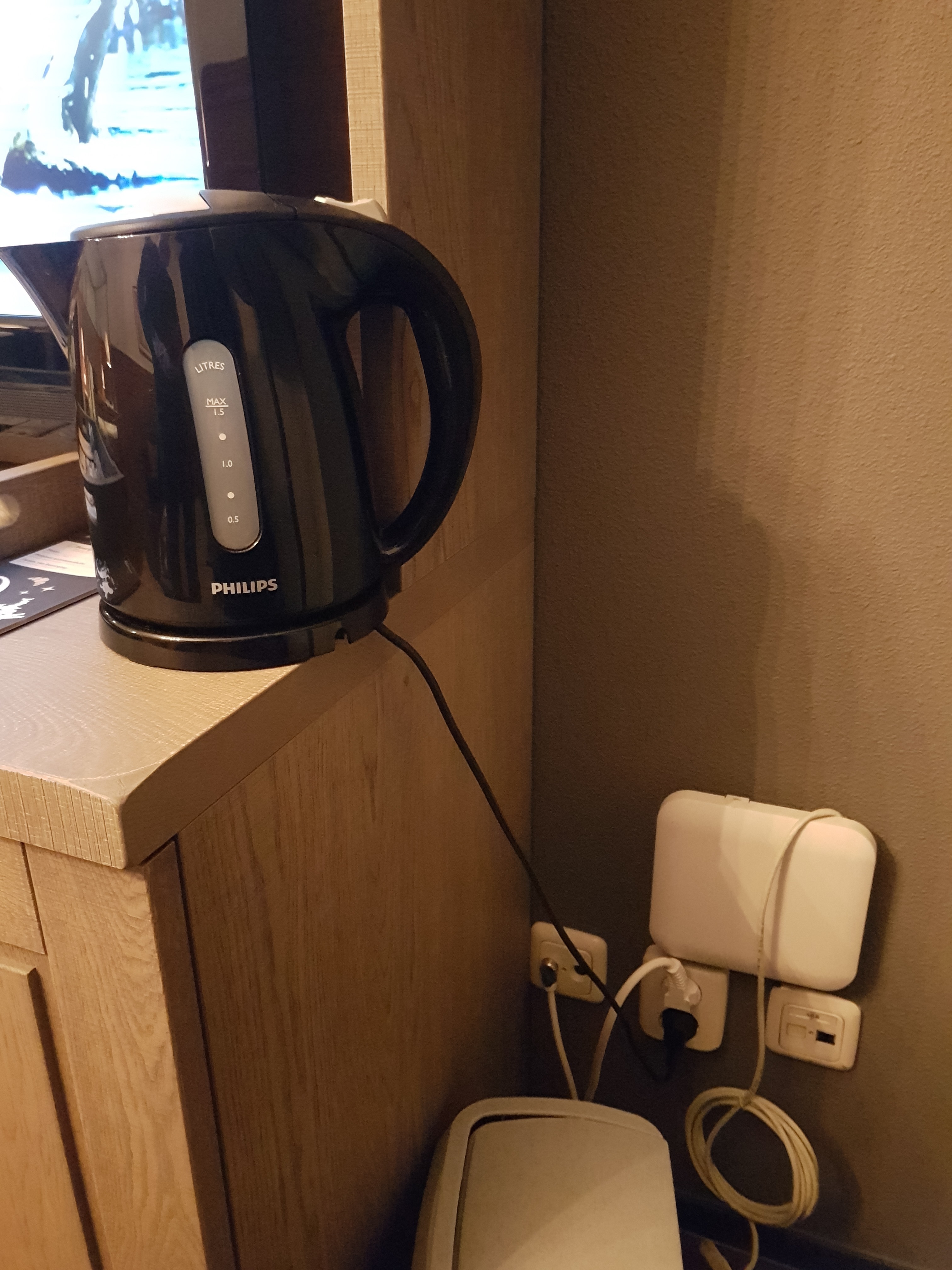 On the first night we wanted to make ourselves a cup of tea so we got the kettle out and started looking around for outlets.