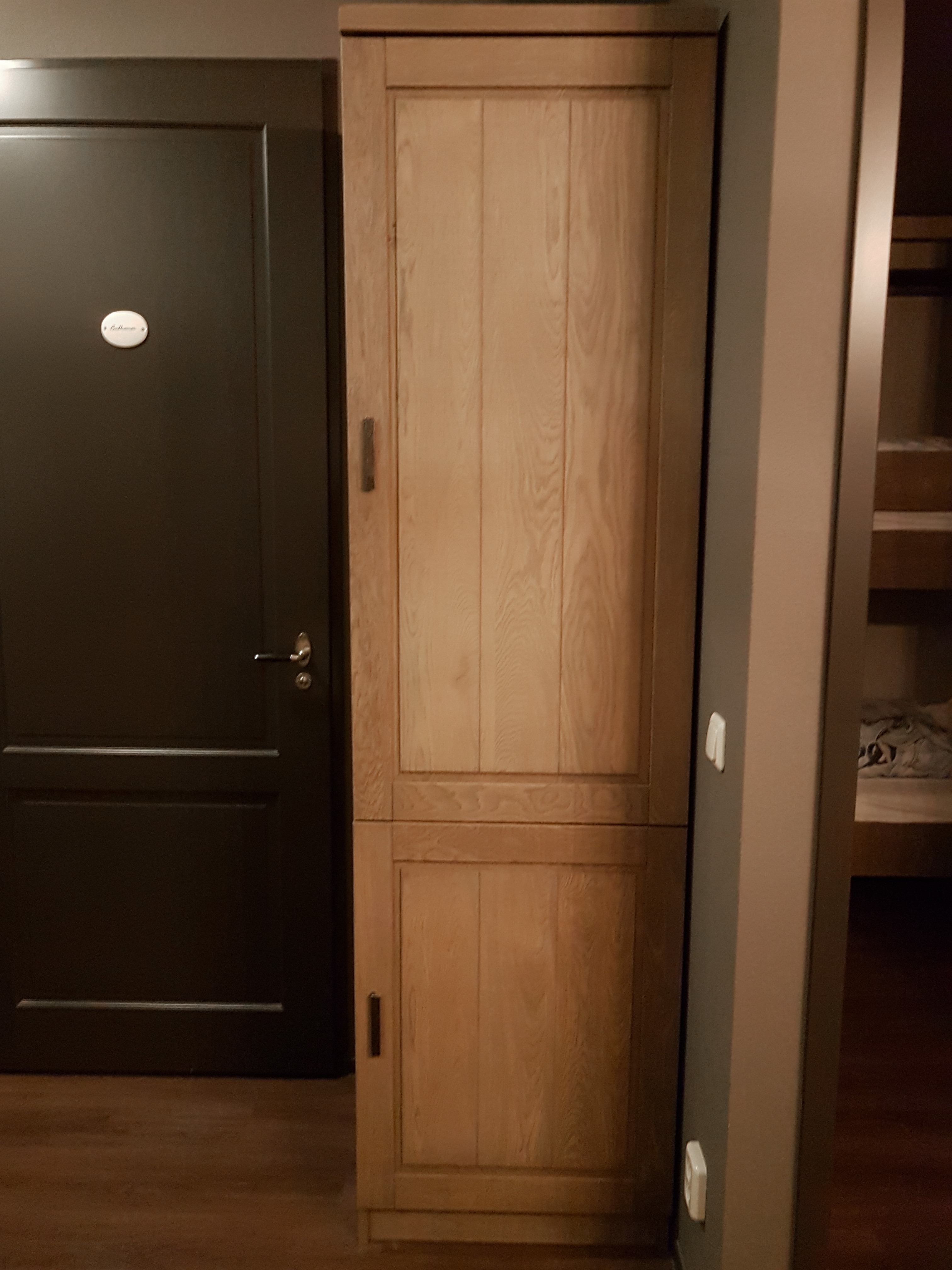 The slim wardrobe in the hallway has a space for hanging clothes, a safe and a cubby space. I don’t think the hanging space is big enough to hang dresses comfortably in summer so that is unfortunate for people who don’t like creases. Also when you open the wardrobe door you tap the light switch on the wall. So if you aren’t careful you end up turning the living room light off.