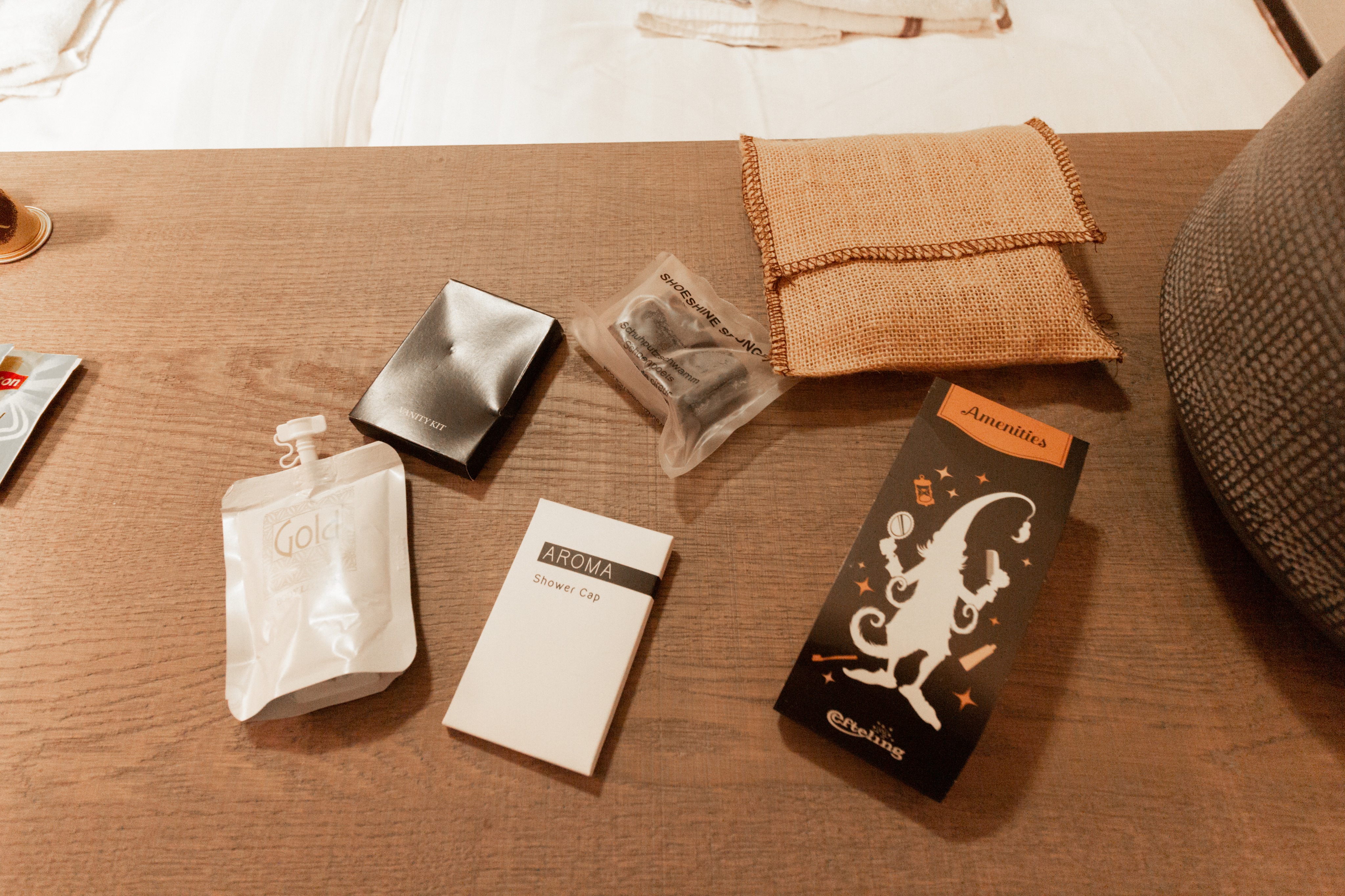 We also got a little Amenities bag which contained shoe shine, a vanity kit, some lotion and a shower cap. The vanity kit contained 3 cotton buds, a nail file and some cotton wool pads. The Gold Body lotion from Italy was mentioned to be vegan friendly, paraben free, dermatologically tested and nickel free. It did not mention that it smells like old grandma perfume. So I love the thought since with the dry winter air I could do with some lotion, but maybe an unscented version might suit better plus it would be extra allergen friendly that way.