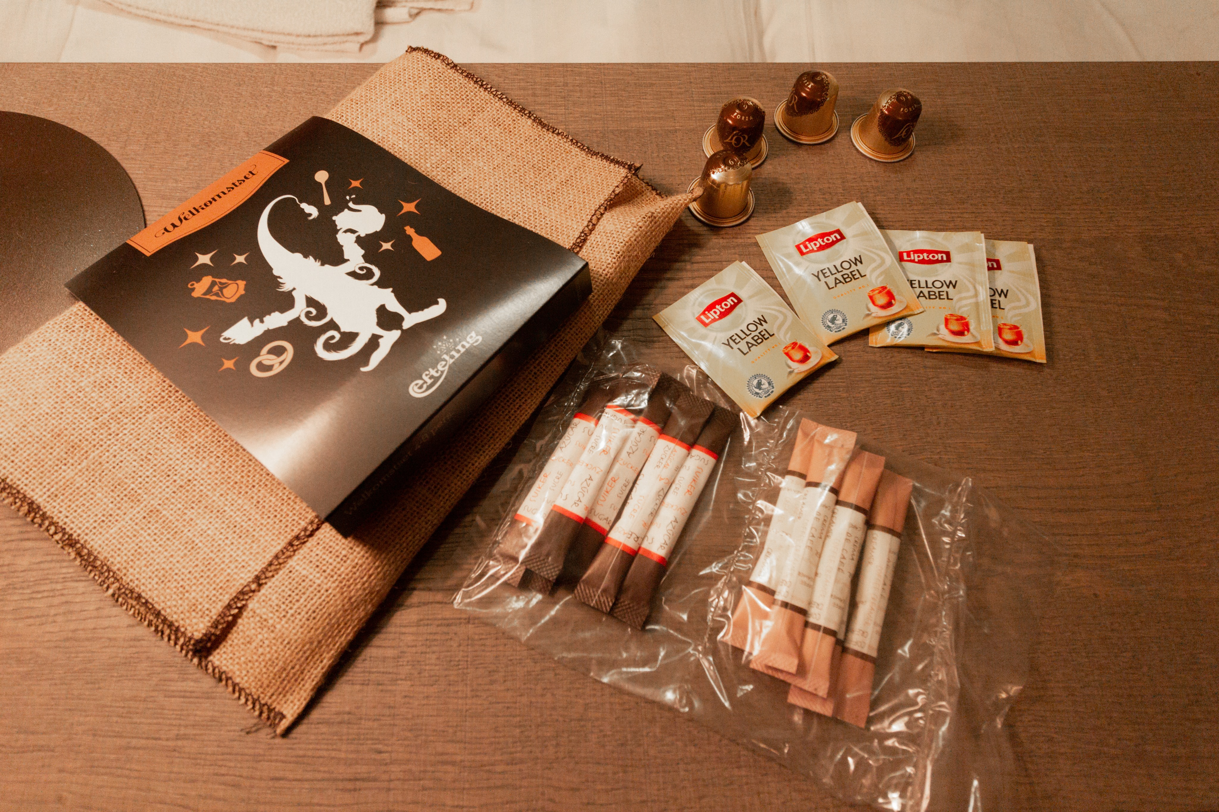 You still get the hessian bag welcome set which contains sugar, creamer, 4 Lipton Yellow label tea bags, and 4 Nespresso coffee capsules. As part of the cleaning service it would be good if these were replenished as well?